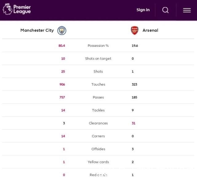 英超官方数据统计,曼城控球率80.4%完虐19.6%的阿森纳,射门之比25-1,蓝月亮25射10次中目标打进5球,枪手仅1脚射门未中目标,角球之比曼城14-0阿森纳,传球次数曼城757-185阿森纳……几乎从第一分钟开始,比赛胜负悬念就已经消亡。